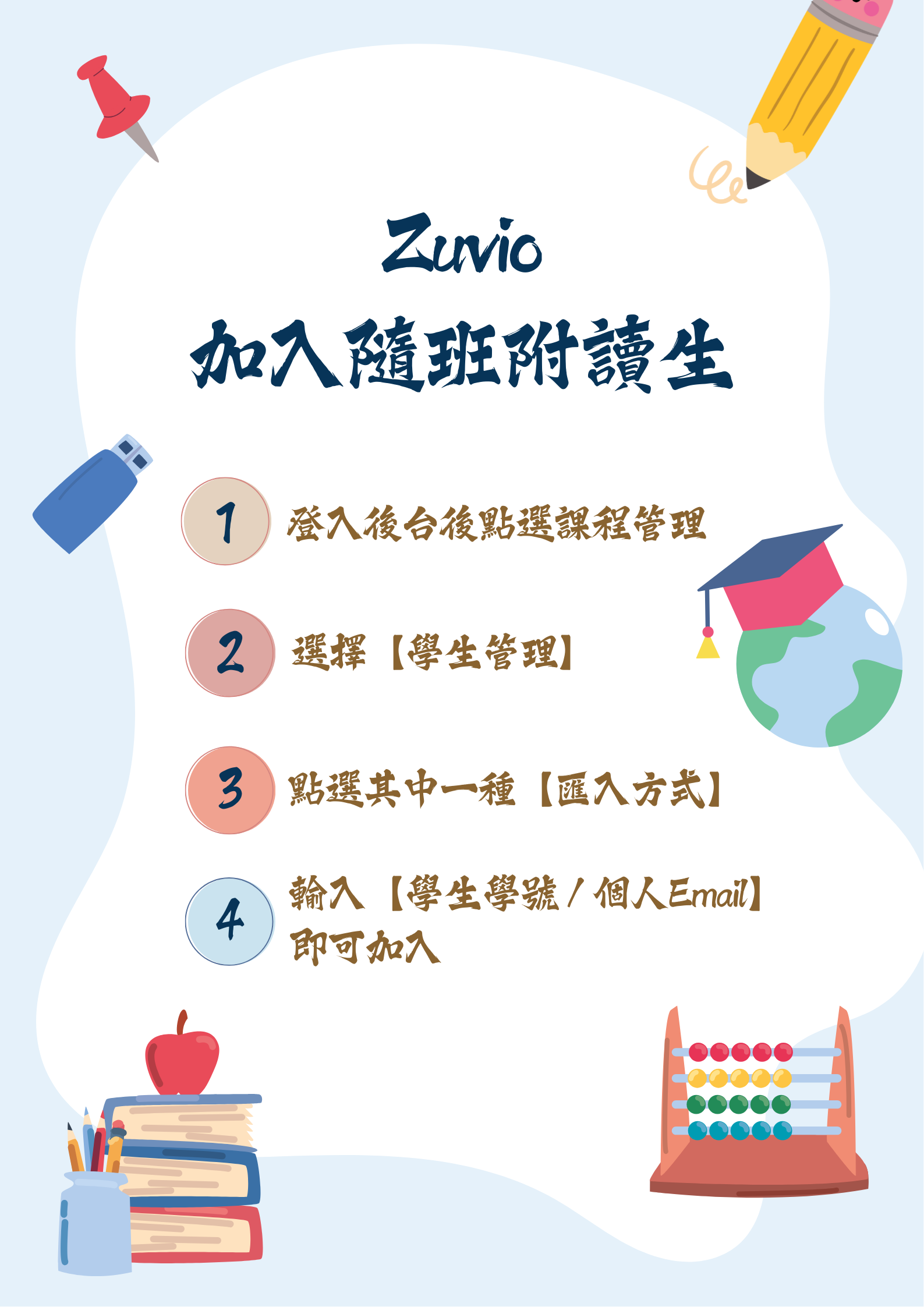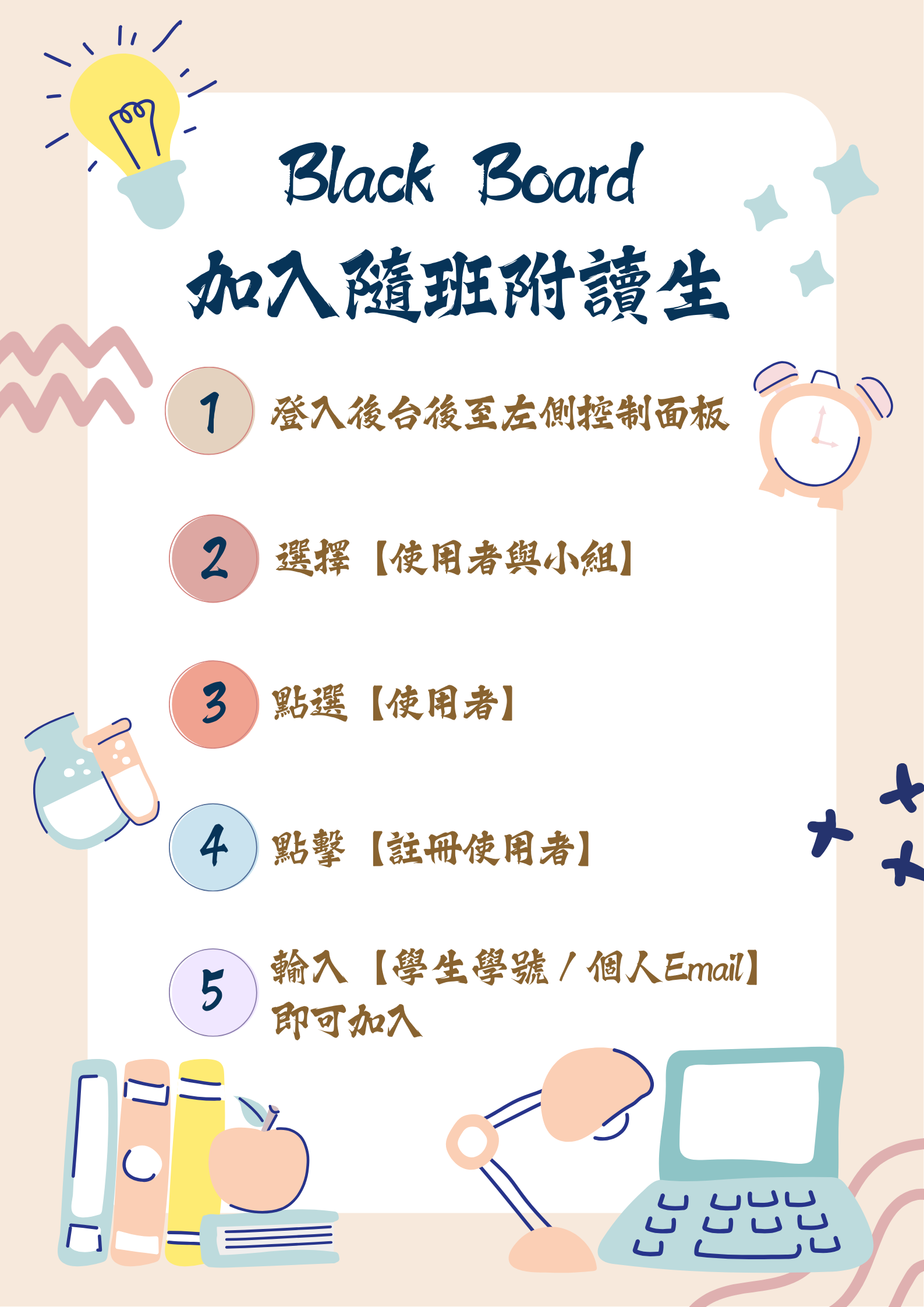 ※本校無提供隨班附讀學生【BlackBoard數位學習管理】、【Zuvio】帳號,如課堂有需要,請自行提供個人Email或學號(身份證9碼數字)予任課教師,請老師將您的Email新增至後台,即可使用該平台