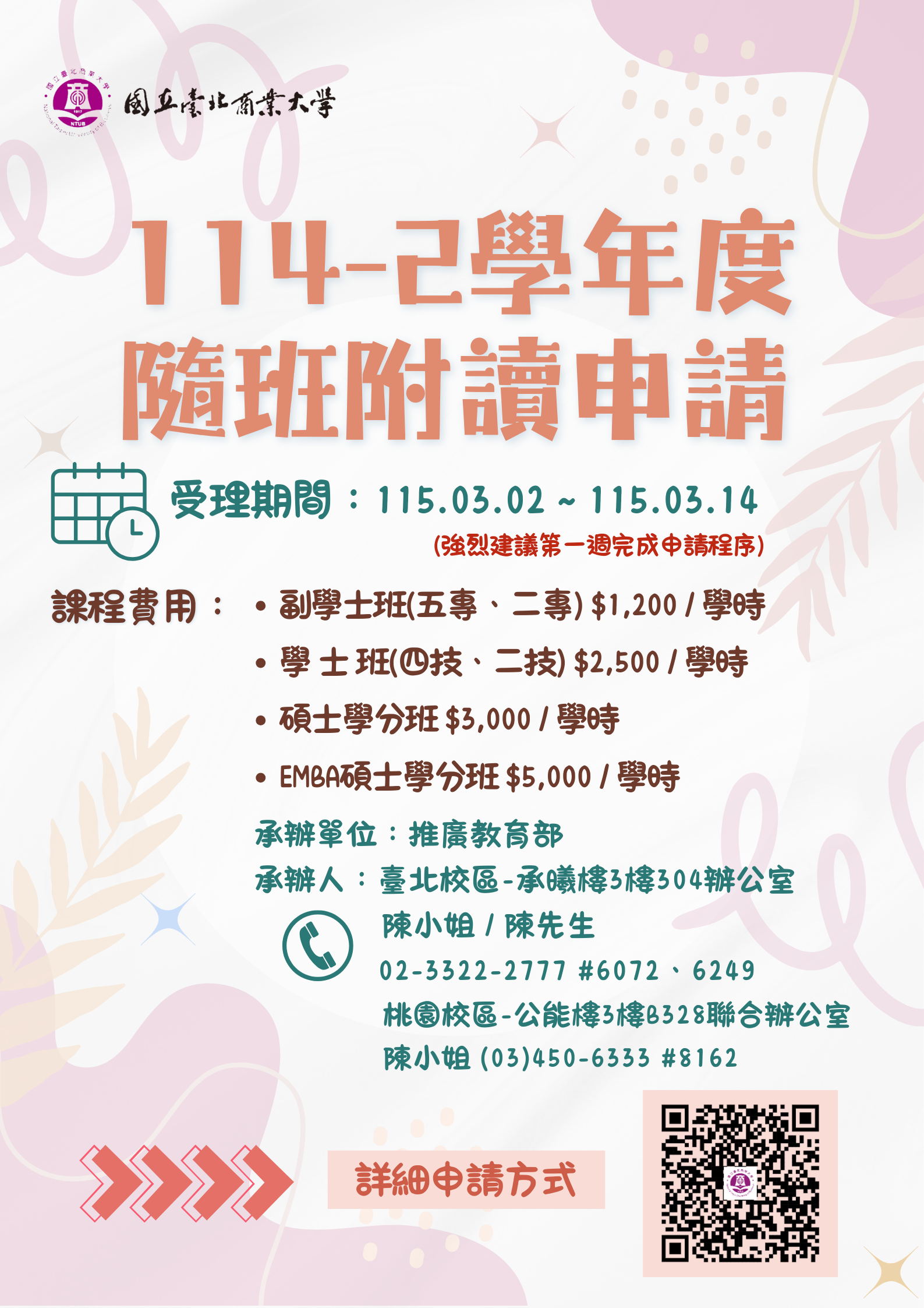 【推廣教育隨班附讀】114學年度第2學期「隨班附讀」申請期間:115.03.02至115.03.14