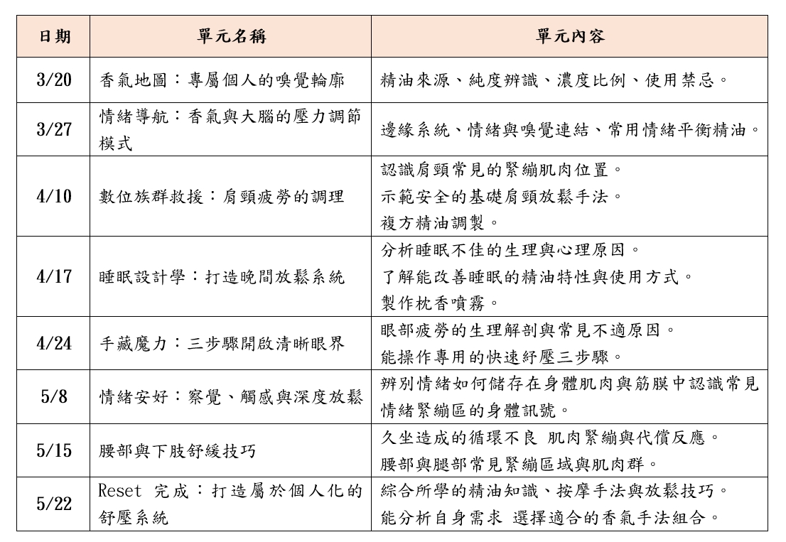 【台北校區】115年度「身心 Reset ! 芳療與舒壓按摩技巧」115.03.20(五)開課~熱烈招生中! 歡迎報名!