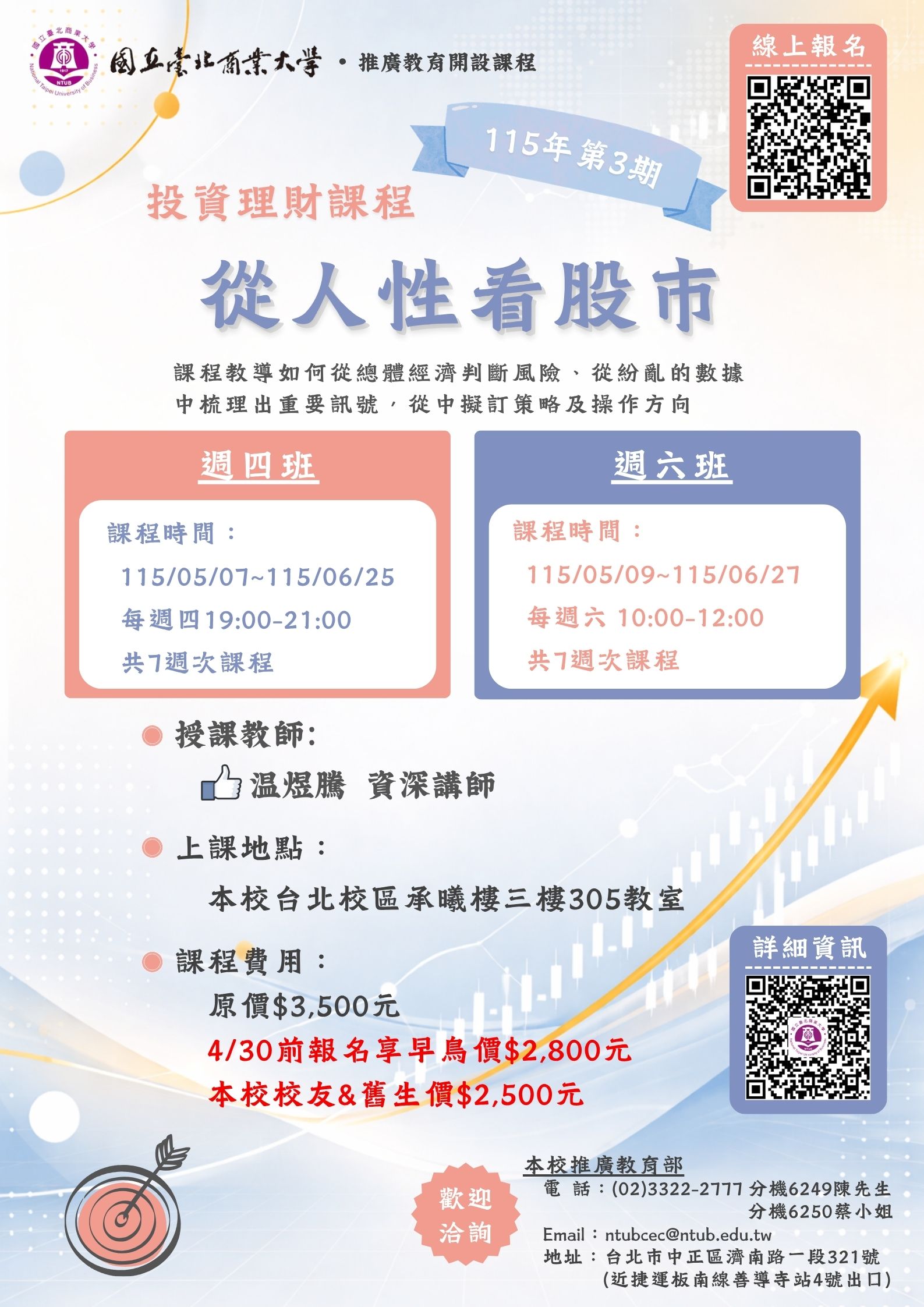 【台北校區】2026年第3期「投資理財-從人性看股市(週四班 / 週六班)」~115年5月份 ★確定開班!歡迎報名!★