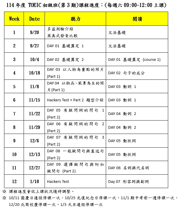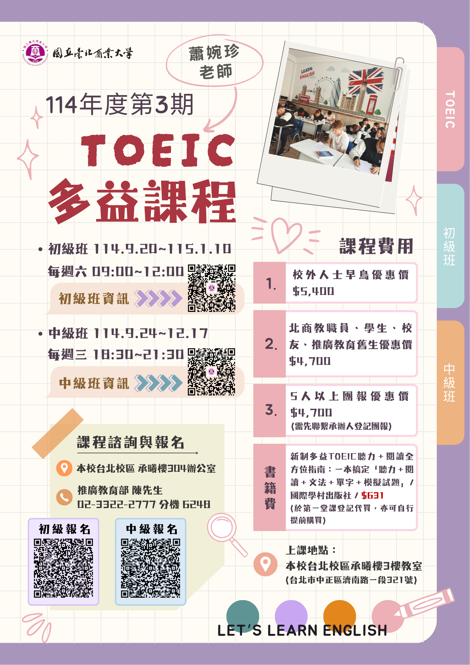 【台北校區】114年度 (第3期)「多益(TOEIC)初級班」114.09.20(六)確定開課~截止報名