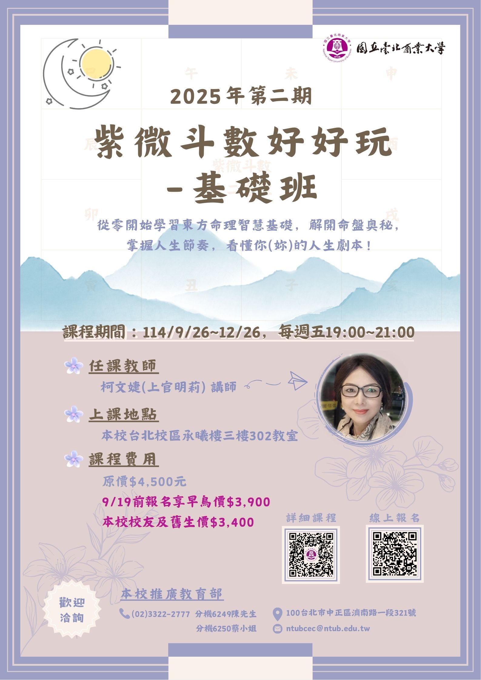 【台北校區】2025年「紫微斗數好好玩-基礎班(柯文婕教師)」114.09.26(五)已開班~截止報名!