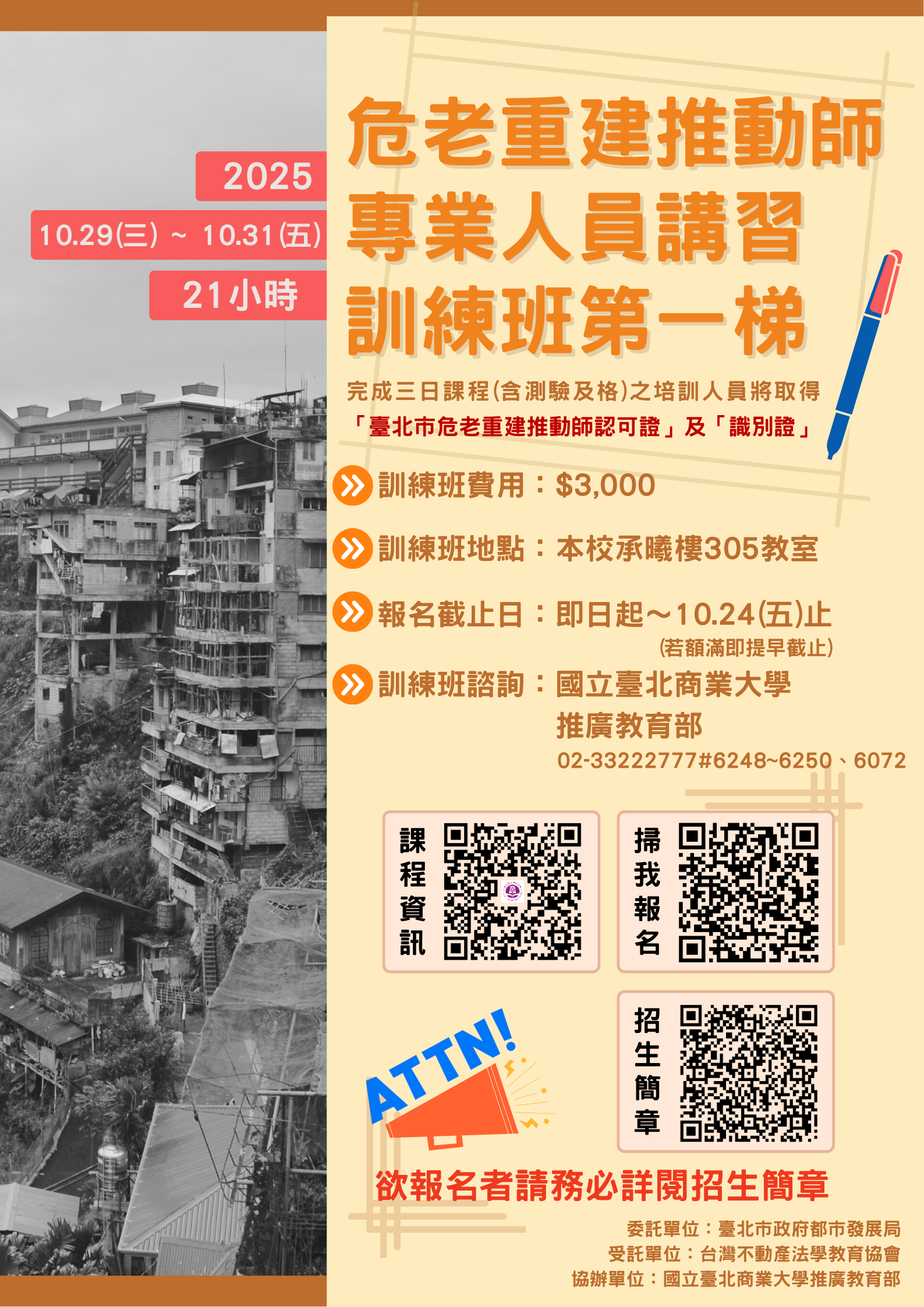 【確定開班!!】114.10.29~10.31~危老重建推動師專業人員講習訓練班第一梯次~熱烈招生中!