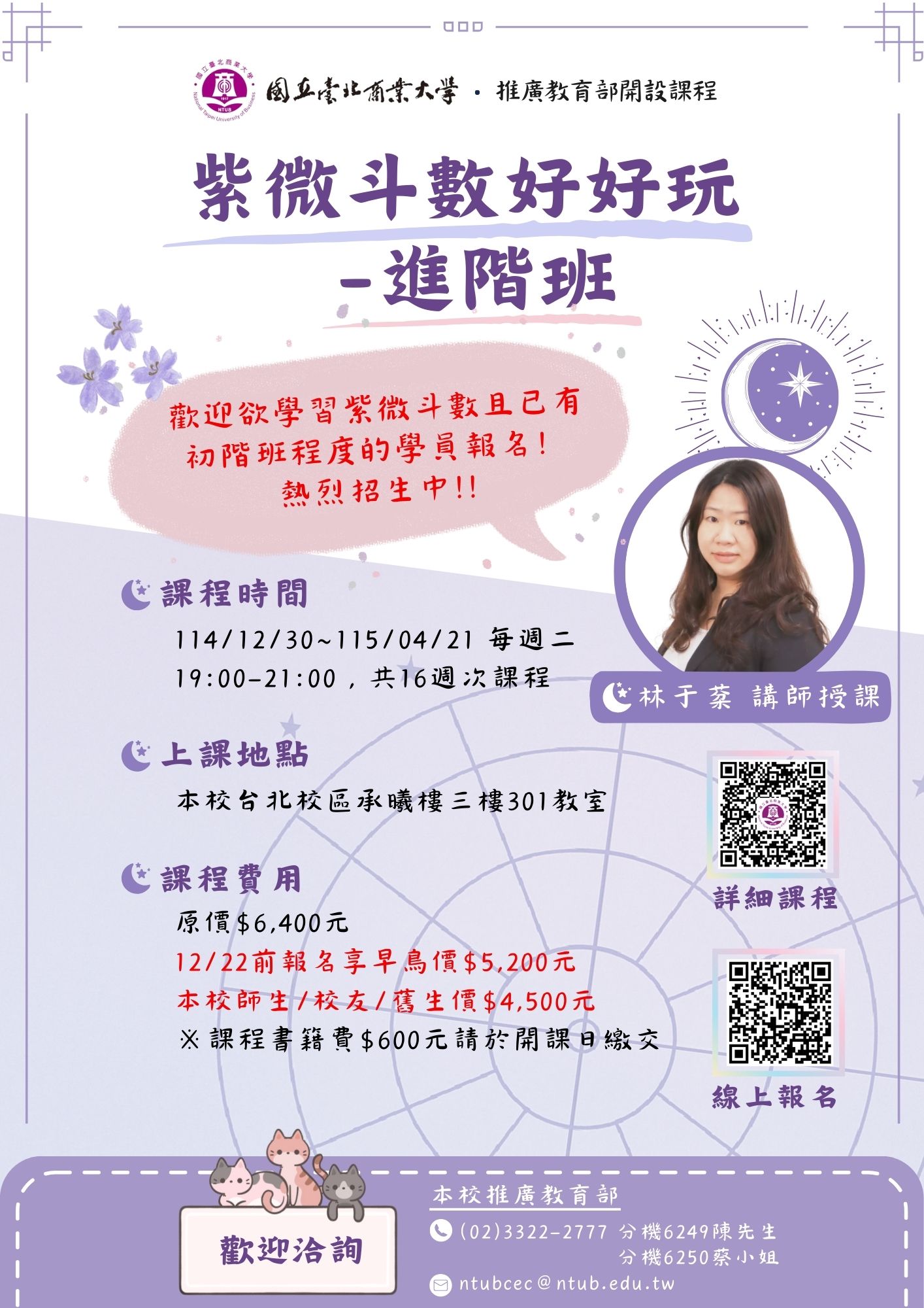 【台北校區】2025年「紫微斗數好好玩-進階班(林于棻教師)」114.12.30(週二)開班,熱烈招生中!