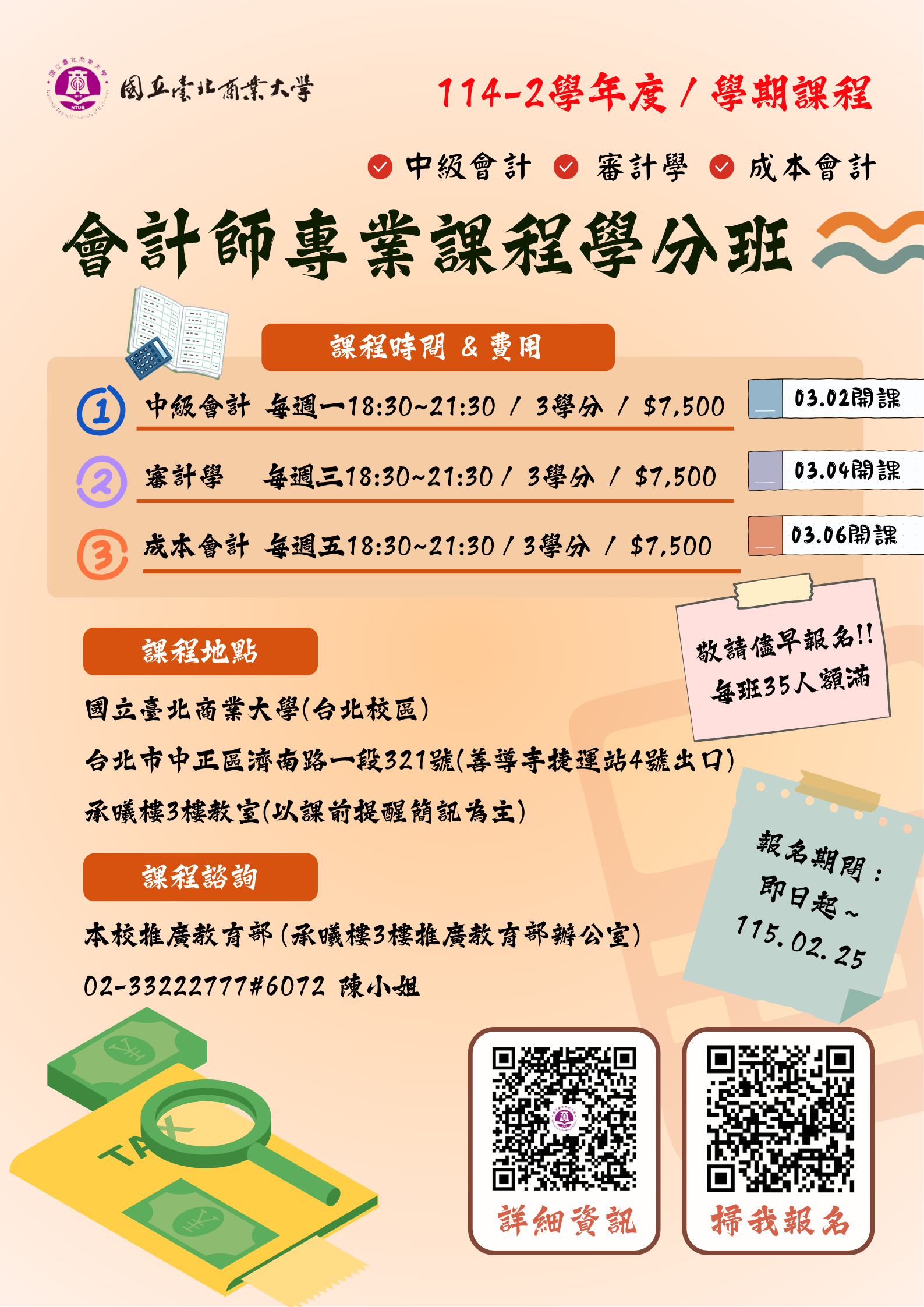【台北校區】115年3月份開課~114學年度第2學期「會計師專業課程學分班」~ 熱烈招生中!!