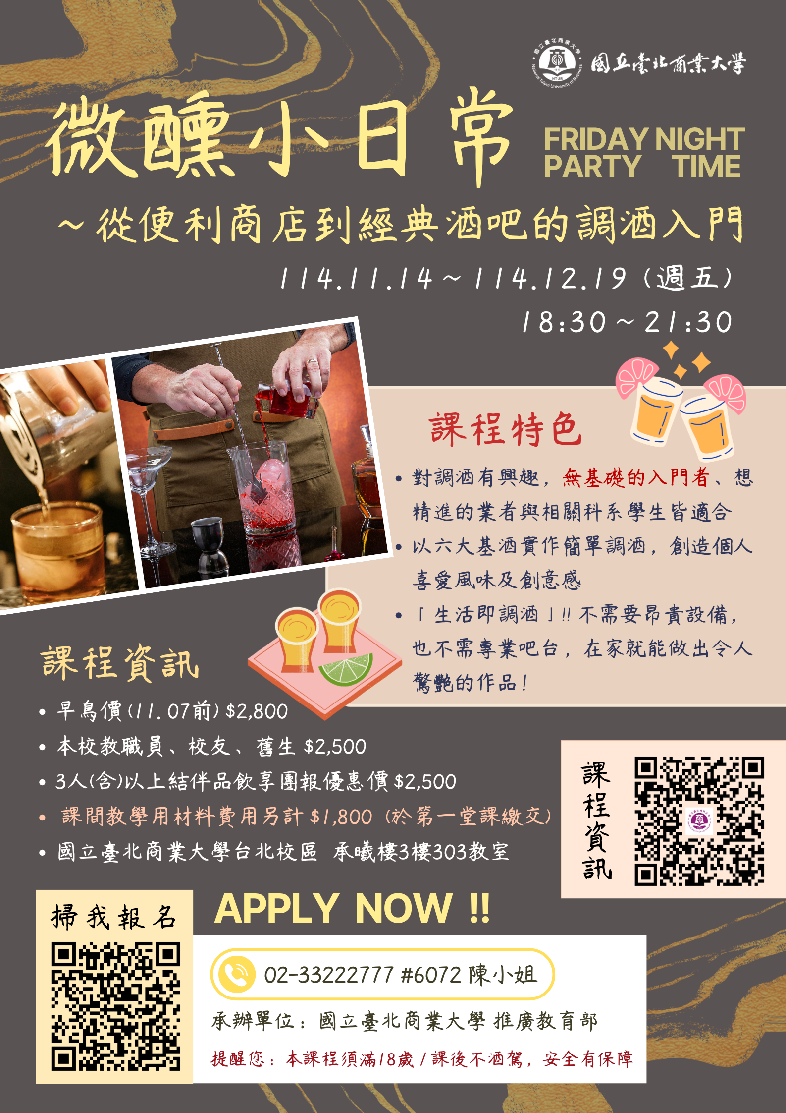 【台北校區】114.11.14(五)微醺小日常-從便利商店到經典酒吧的調酒入門~熱烈招生中!!