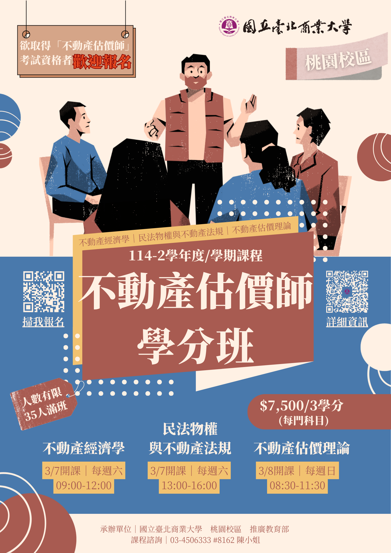 【桃園校區】115年度 (第1期)「不動產估價師課程學分班」115.03.07(六)開課~熱烈招生中! 歡迎報名!