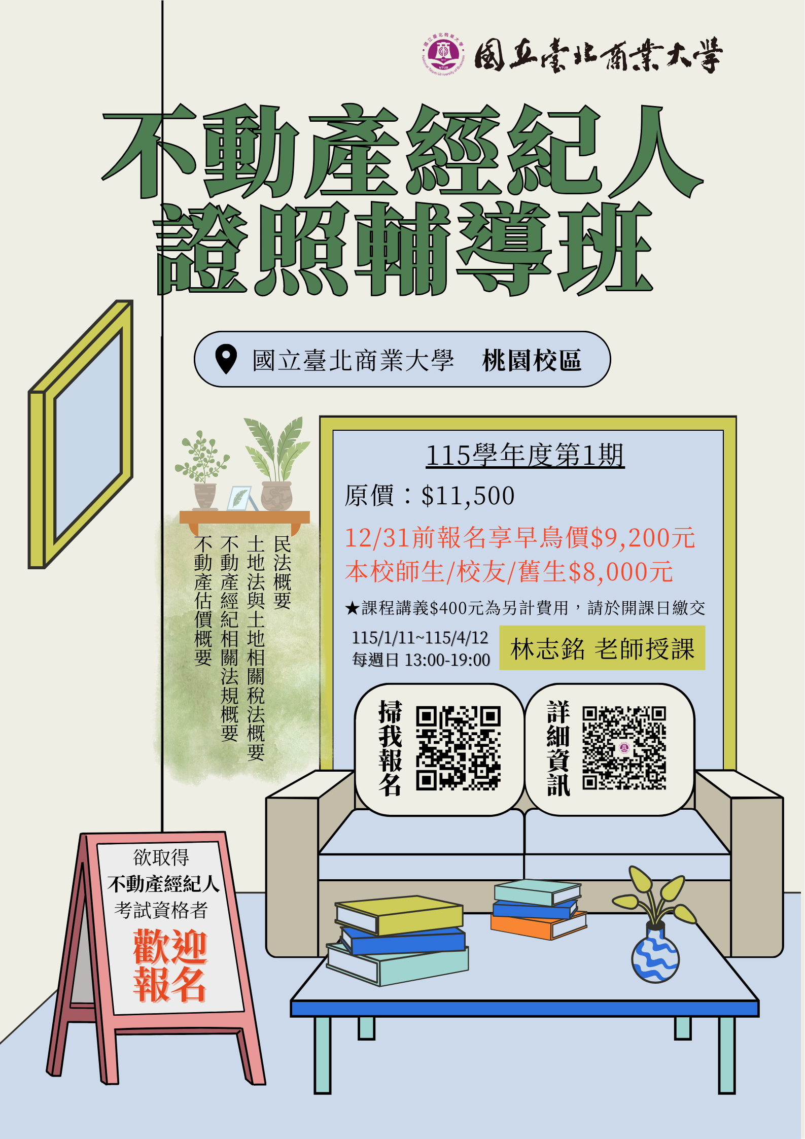 【桃園校區】115年度 (第1期)「不動產經紀人證照輔導班」115.01.11(日)開課~熱烈招生中! 歡迎報名!