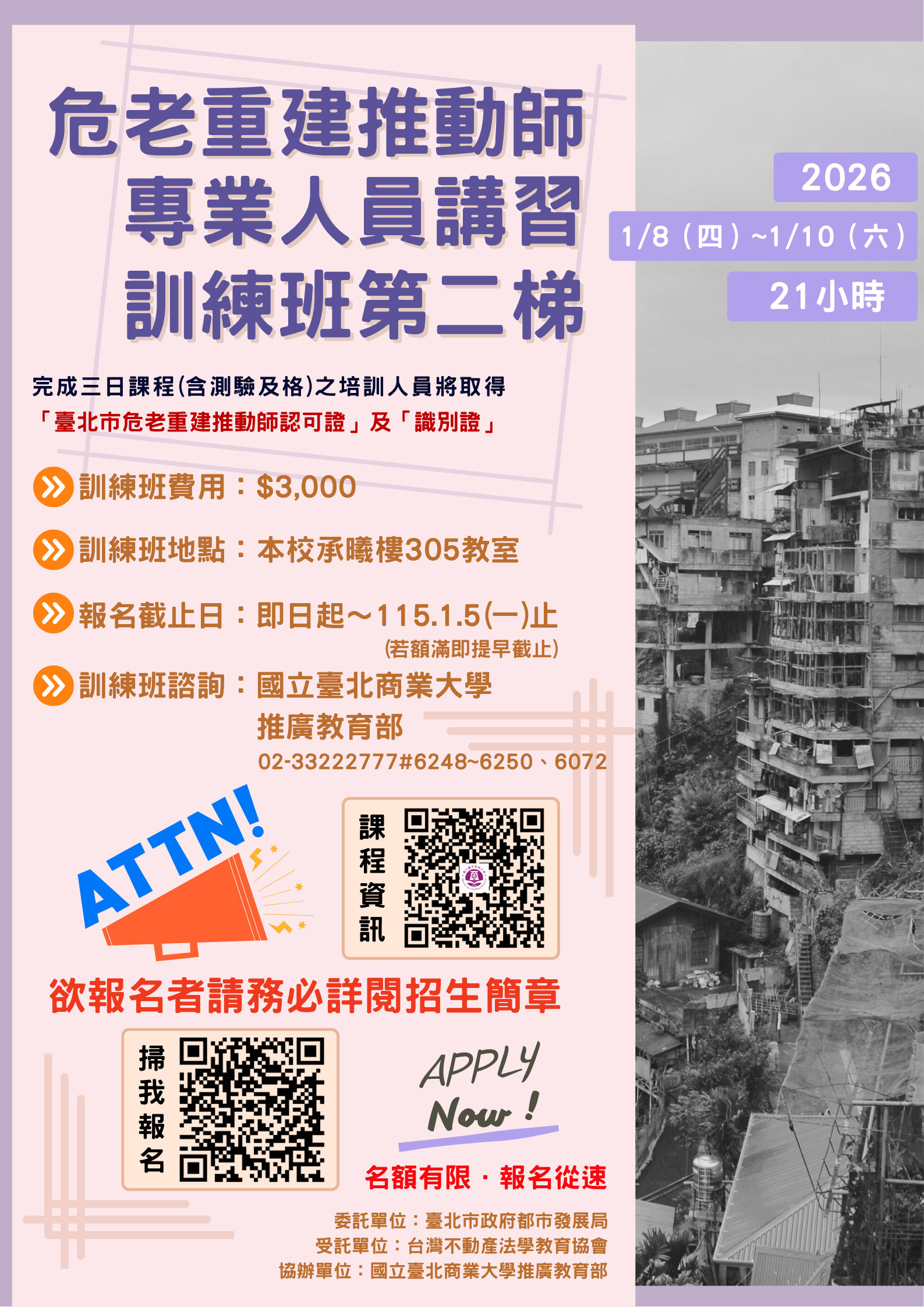 【台北校區】115.01.08(四)~01.10(六)危老重建推動師專業人員講習訓練班第二梯次~熱烈招生中!