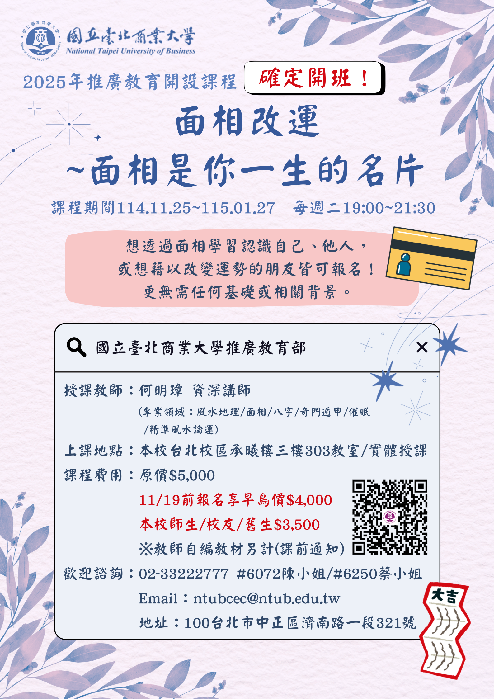 【確定開班~台北校區】 面相改運~面相是你一生的名片!! 114.11.25(二)~熱烈招生中!!!