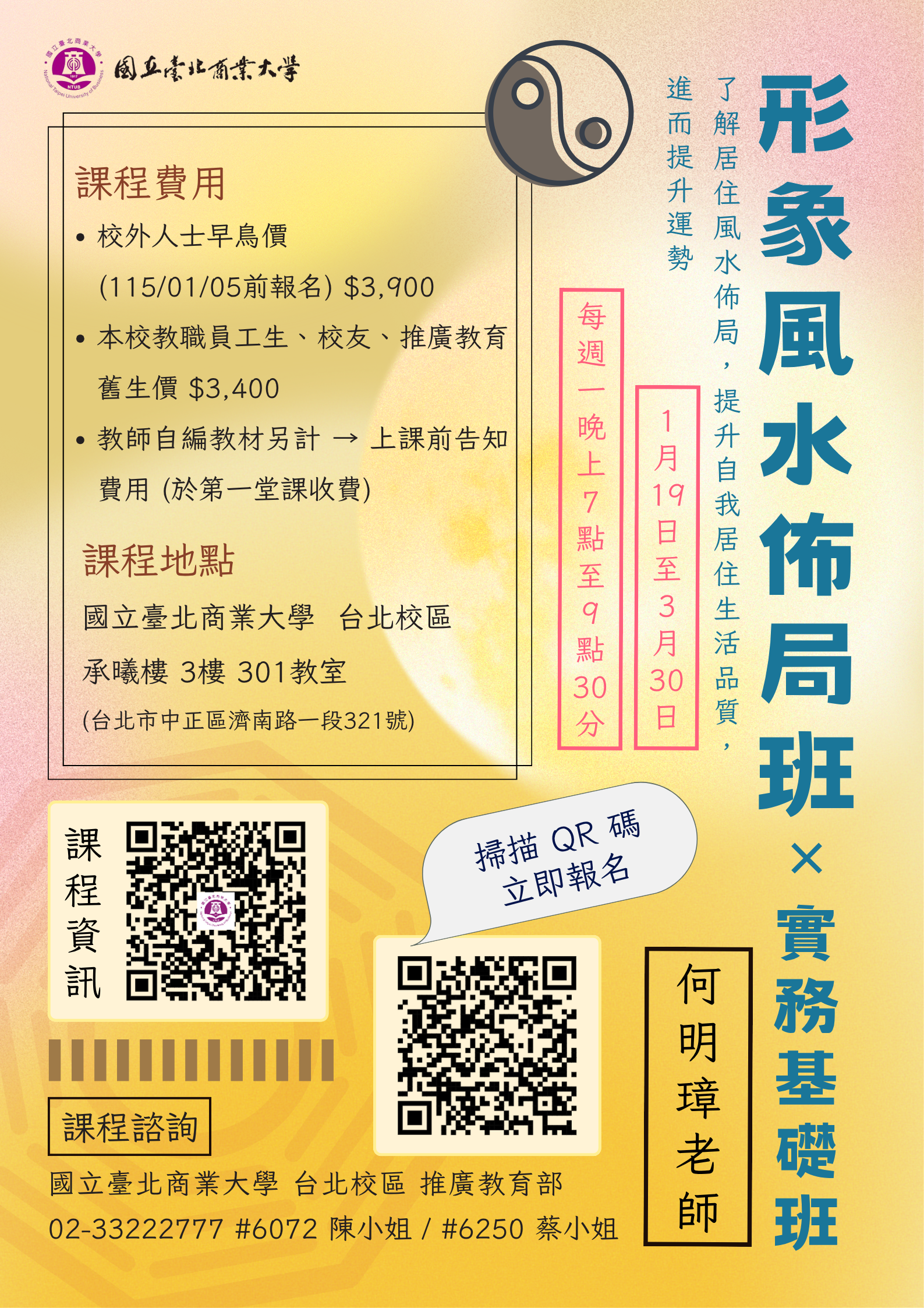 【台北校區】形象風水佈局班 x 實務基礎班 115.01.19(一)開課~歡迎報名!!