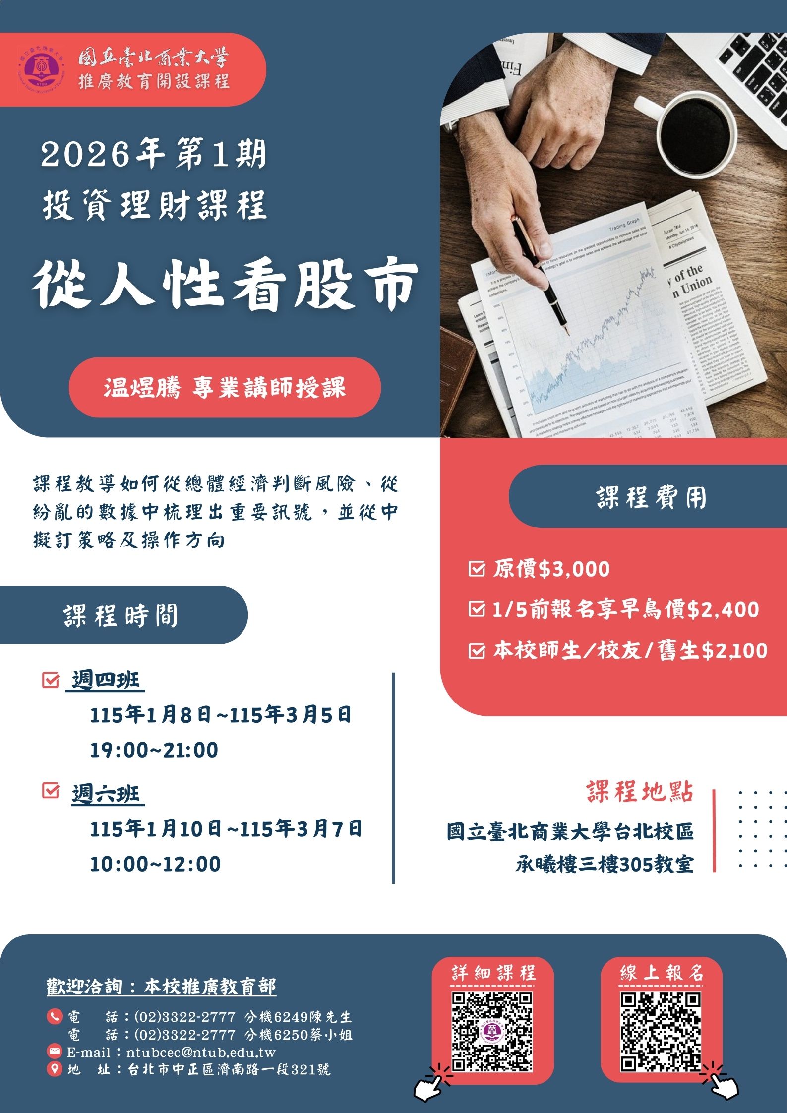 【台北校區】2026年第1期「投資理財-從人性看股市(週四班 / 週六班)」~熱烈招生中!歡迎報名!