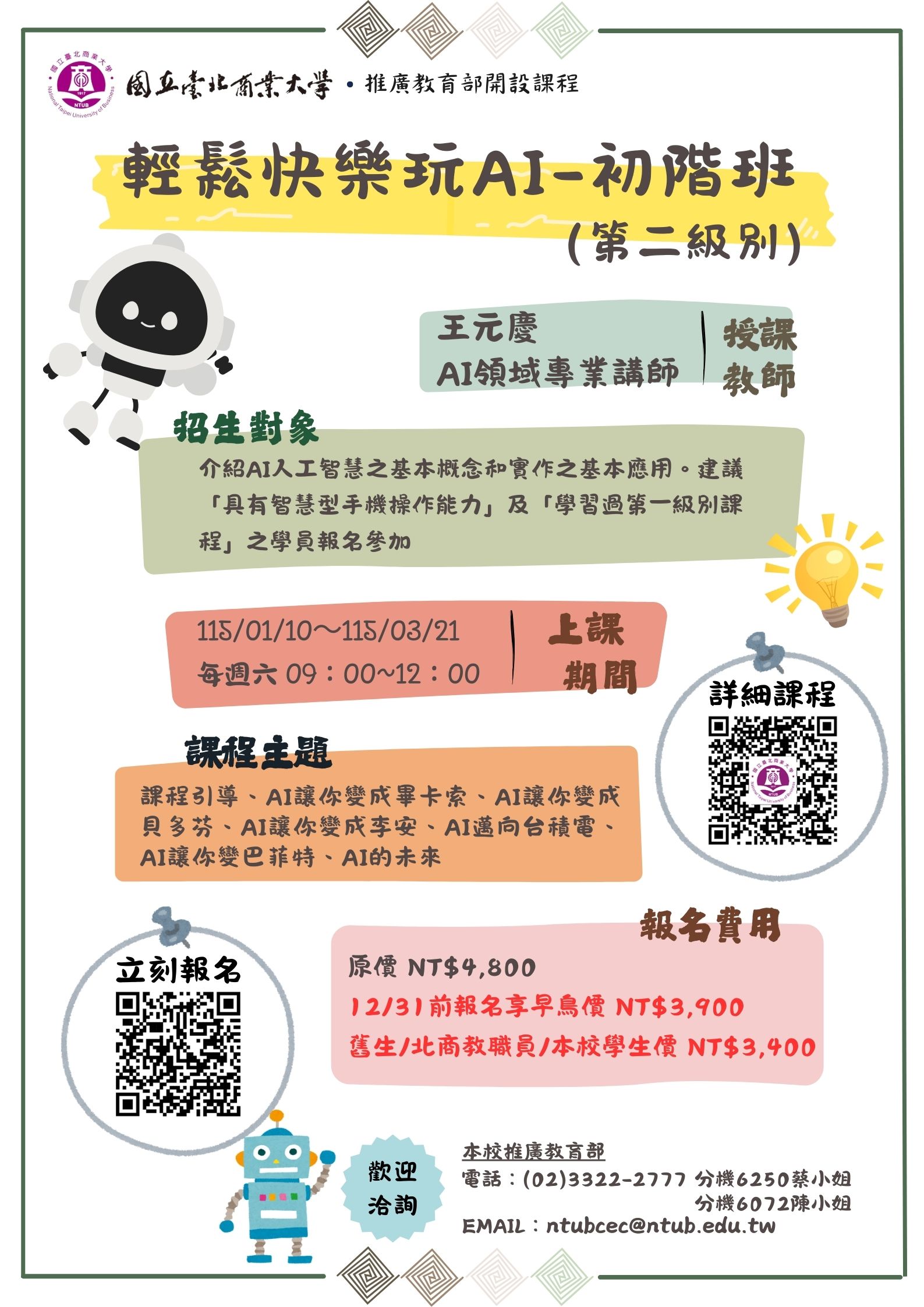 【台北校區】2026年「輕鬆快樂玩AI-初階班(第二級別)」-115.1.10(週六)確定開班!歡迎報名!