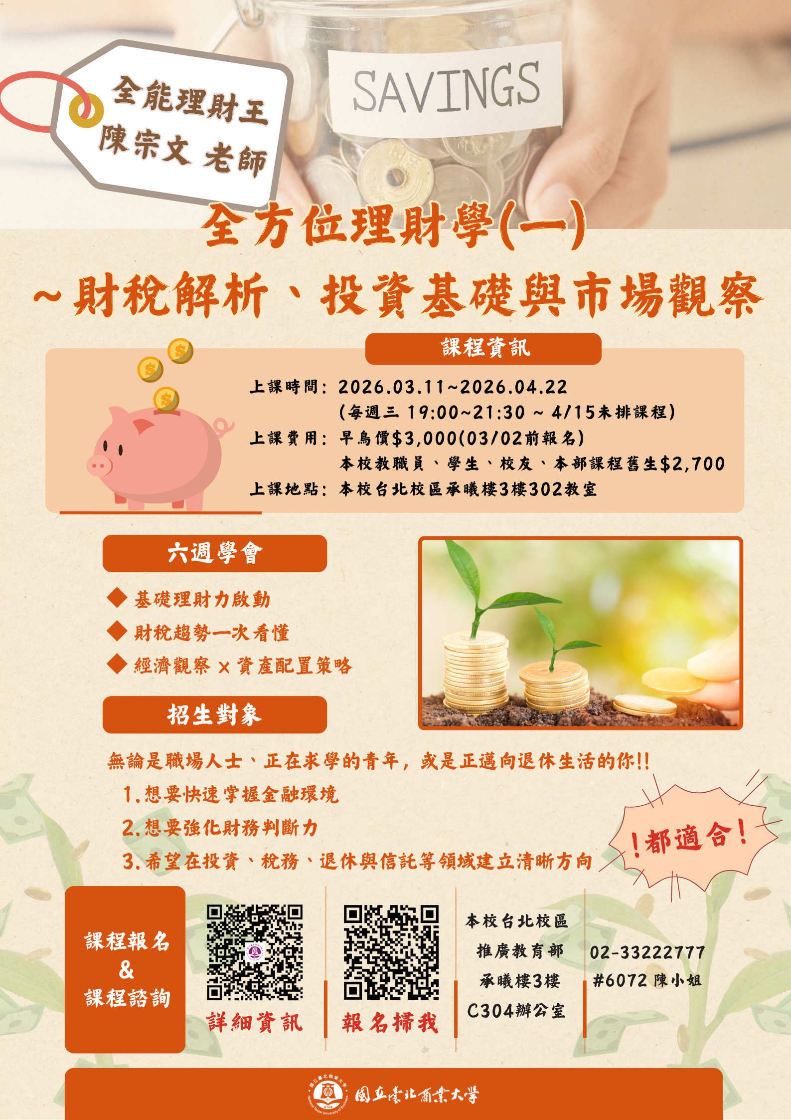 【台北校區】3/11(三)開課!全方位理財學(一):財稅解析、投資基礎與市場觀察~熱烈招生中歡迎報名!!