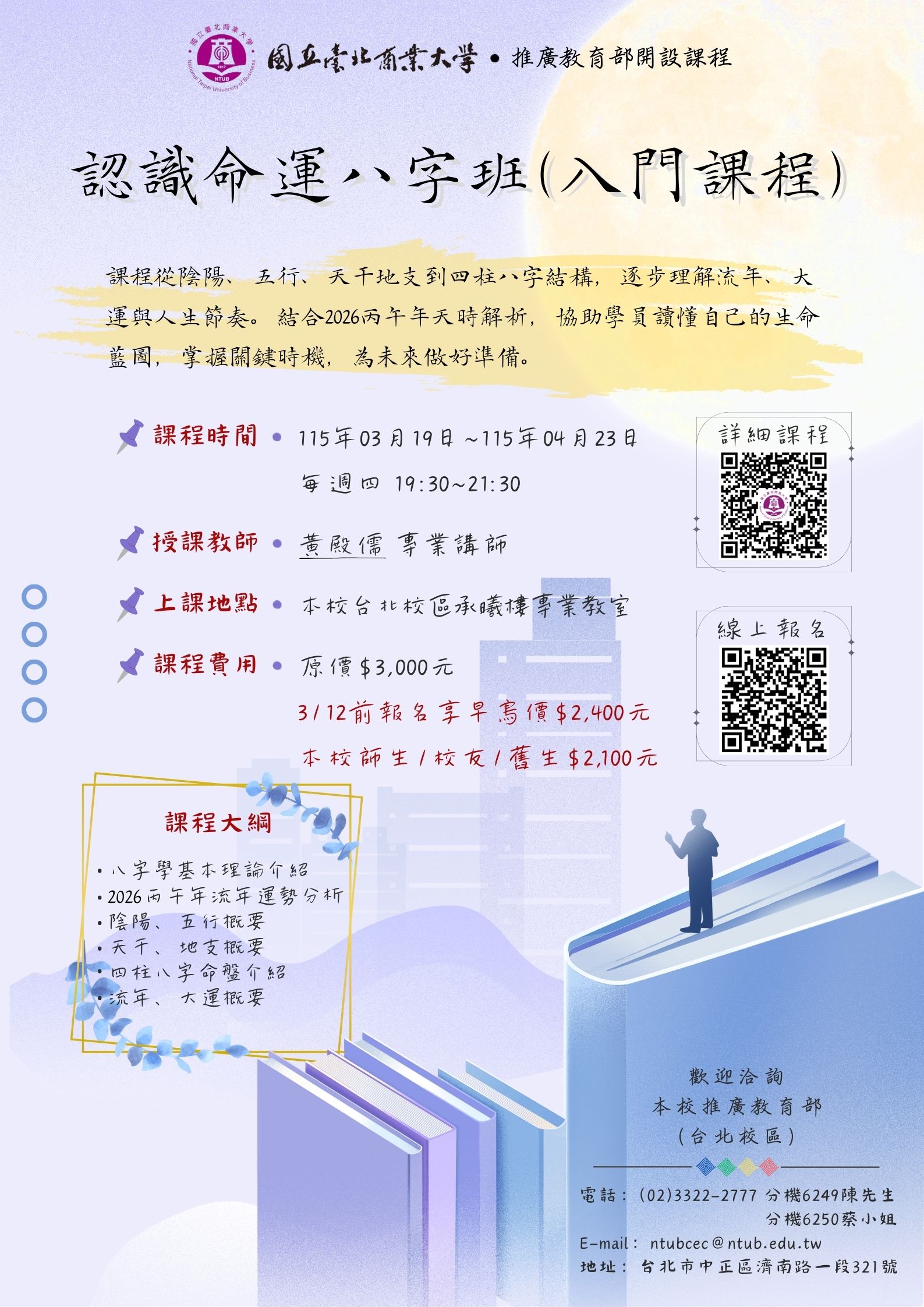 【台北校區】2026年度「認識命運八字班(入門課程)」~115.3.19(週四)開班!歡迎報名!