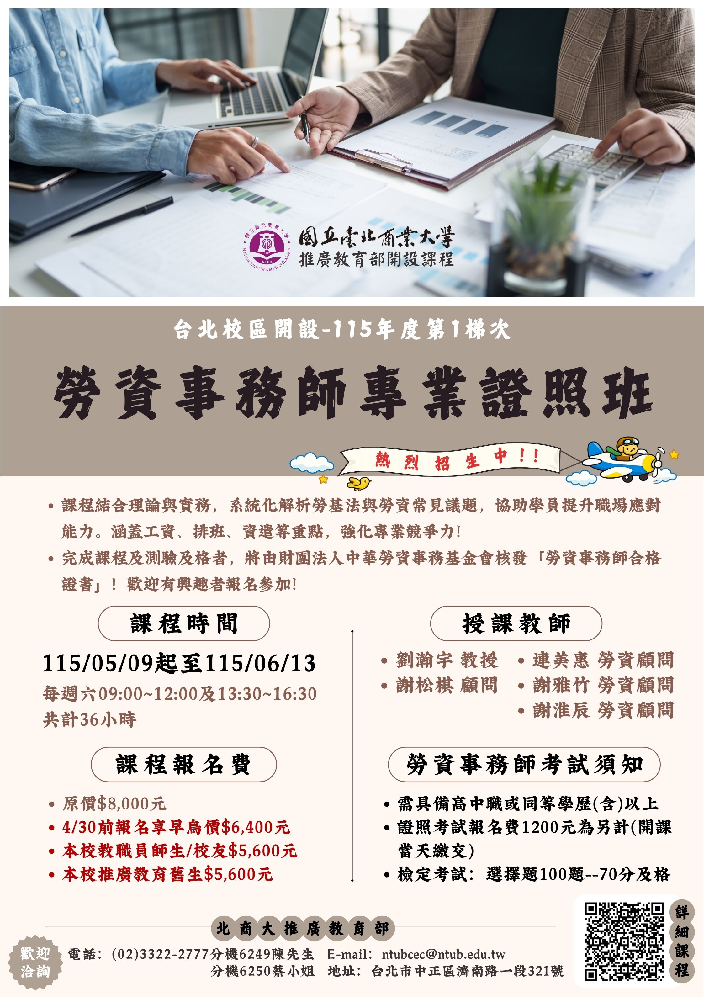 【台北校區】115年度第1期「勞資事務師專業證照班」115.05.09(六)開班~熱烈招生中!歡迎報名!