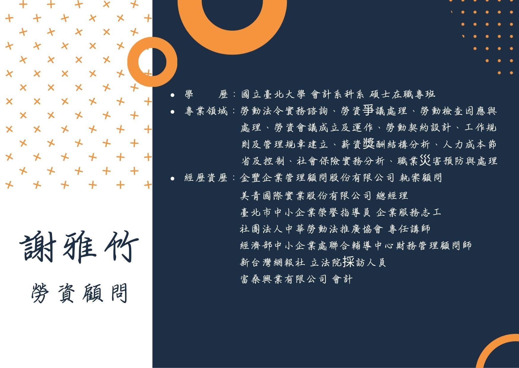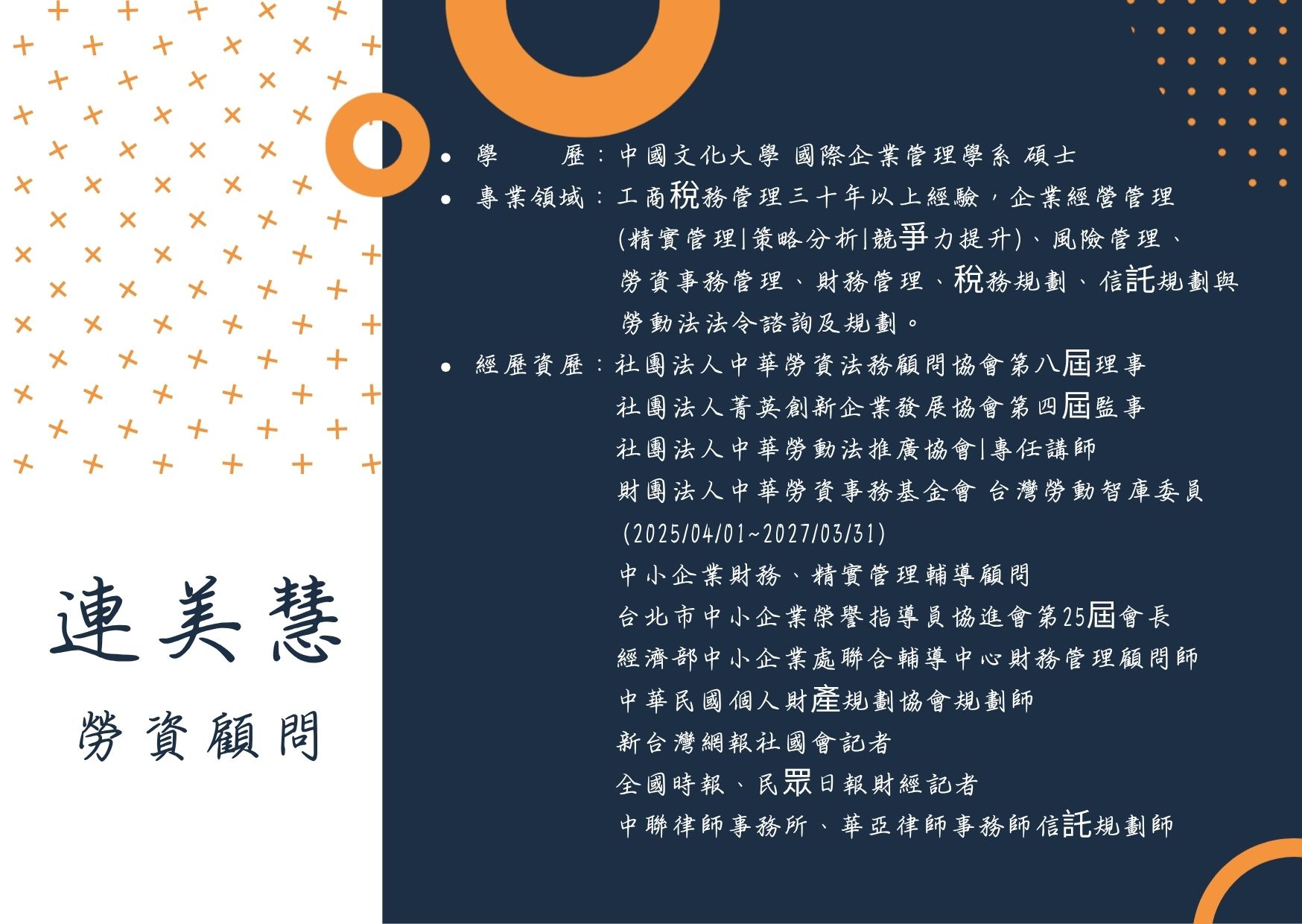 | 預期成效 | 強化人資與管理人員之勞動法實務應用能力,系統掌握《勞動基準法》及相關規範(包含勞動契約、工時制度、職業災害處理等)。透過風險辨識與制度建構,預防違法解僱與管理瑕疵,降低勞資爭議發生率,協助企業落實法遵經營,打造兼顧權益保障與營運效能的雙贏局面。 | |||||