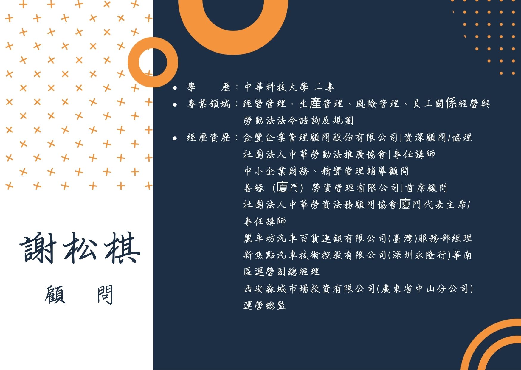 | 13:30~16:30 | 謝松棋 | 勞動基準法(二) | 1.休假與勞請假權益 2.解僱、資遣與離職 3.退休制度 |
